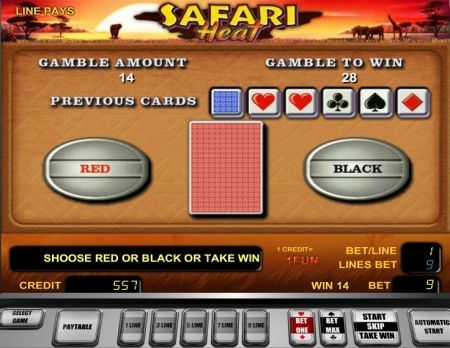 При всех звуковом оформлении изменяется и цветовая схема игрового поля, а основные кнопки управления становятся неактивными. Вверху экрана находится информационное поле, которое и будет указывать на количество доступных бонусных прокруток. Как только бонусная игра закончится, автомат подсчитает ваш суммарный итог бонусного выигрыша и добавит его к основному призу. Учитывая, что Сафари относится к серии гейминаторов, он также содержит игру на удвоение выигрыша.
