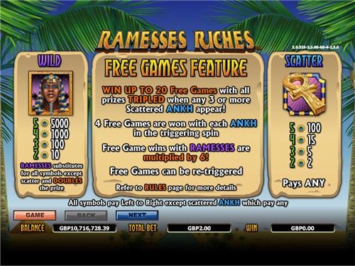 Свой очередной слот компания производитель программного обеспечения Микрогейминг решила посвятить богатствам легендарного египетского фараона Рамзеса. На слот была добавлена увлекательная риск-игра, бесплатные спины и даже сама красавица Клеопатра.