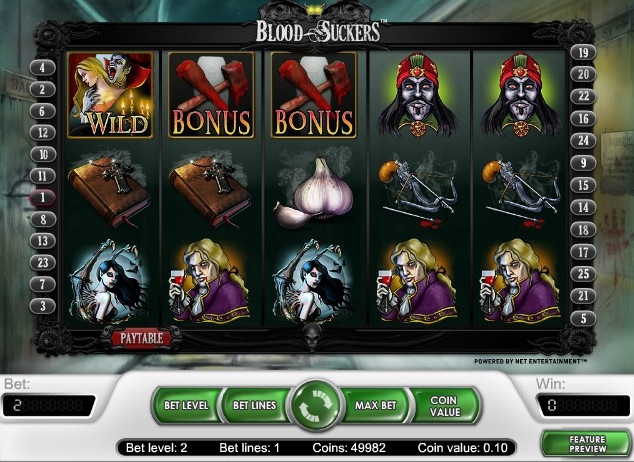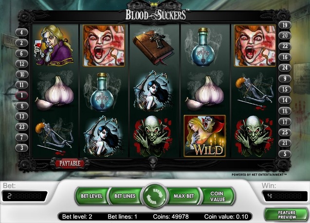 Игровой автомат Blood Suckers от компании Net Entertainment раскрывает тему вампиров. Это классический игровой слот с 5 барабанами и 25 линиями выплат. Игра довольно атмосферная. С каждой выигрышной линией вы слышите оригинальные звуки, создающие игровую атмосферу, и вы уже оказываетесь в своем воображении в старинном замке с Дракулой, пьющего кровь невинных жертв. На барабанах вы увидите символы, которые соответствуют данной теме. Здесь и вампиры в разных ракурсах, и способы борьбы с ними: стрелы с серебряными наконечниками, чеснок, серебряный крест и святая вода.