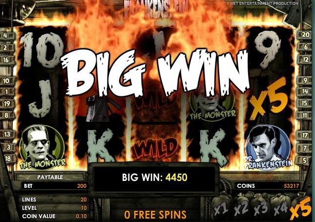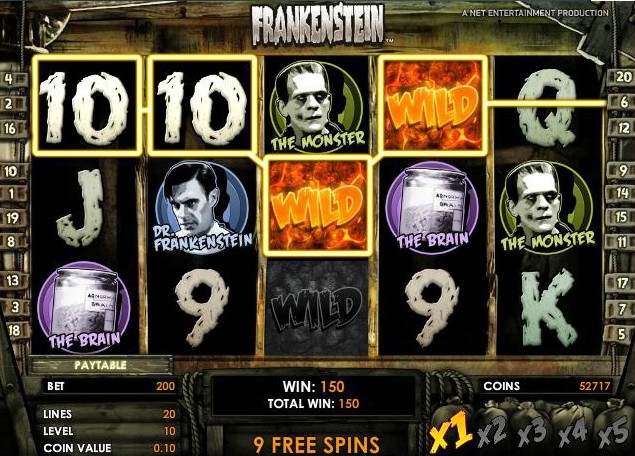 Франкентштейн страшен, но при этом по-детски наивен. Гениальное творение обернулось проклятием, и по вине монстра погибает ребенок. Люди разгневаны. Они собираются вместе и идут с факелами, чтобы убить монстра. Чем закончится этот невероятный триллер? Играйте на слотах «Франкенштейн» и выигрывайте призы, раскрывая новые сюжетные повороты этой увлекательной истории. И основная игра, и бонусная включает в себя много интересного. Атмосфера нагнетается постепенно и вот уже на экране ¬разгневанная толпа, которая готова сжечь все на своем пути. На барабанах один за другим сгорают символы, которые были заменены дикими. После яркого пламени они потухают и становятся черными как пепел. Как и огонь, символы не сгорают поодиночке. Один горящий символ поджигает другой, а затем третий. NetEnt запатентовала эту опцию под именем Linked Wild symbols.