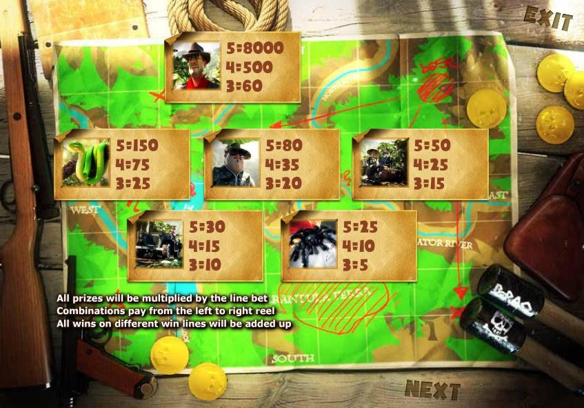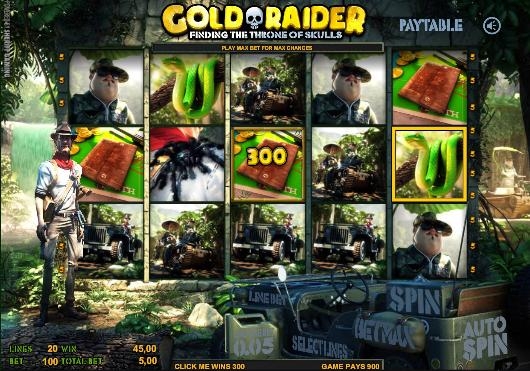 Вовремя игры на слоте "Gold Raider", Золотоискатель путешествует по дорогам Вьетнама дабы отыскать жёлтый металл. Малахитовые змеи, озлобленные мартышки, мохнатые пауки и Вьетконг – вот все преграды, встречающиеся на пути у Золотоискателя. Побеждайте в игре “Click Me”, в ней показываются три знака "Click Me" в разных положениях экрана, и нажимайте до того, пока не покажется указатель “Collect”. Знак книжки странствий в "Click Me"доступный исключительно первому, третьему и пятому барабанам.