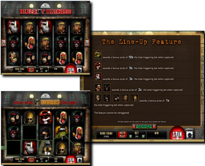 Меню игры состоит из нескольких кнопок – для регулирования количества линий и суммы ставки, для запуска барабанов, для перехода в режим автоигры. Звуковое оформление «Mugshot Madness» напомнит вам старый добрый фильм про гангстеров и отважных детективов. Хотя бонусные раунды и отсутствуют, но есть большая вероятность заработать бесплатных вращений.
