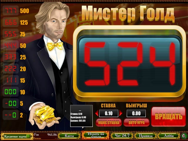 Желаете сорвать куш в 7500 долларов? Тогда безо всяких колебаний приступайте к игре на виртуальном игровом автомате «Мистер Голд», который оборудован тремя барабанами и одной линией выплаты. Вы имеете отличную возможность превратить числа в настоящее золото. Соберите ценные комбинации и слот «Мистер Голд» действительно Вас озолотит! Не забывайте, что по-настоящему большого успеха добиваются лишь те, кто не боится рисковать! Поэтому если хотите унести с собой максимальный денежный приз – играйте на максимальных ставках!