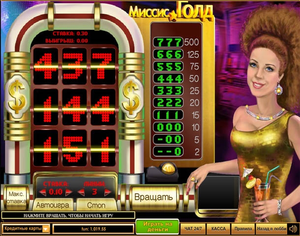 Разумеется, каждому из нас очень хотелось бы выиграть две с половиной тысячи долларов в игровом автомате. Однако далеко не все слоты онлайн предоставляют подобную возможность. К счастью, захватывающий современный гейминатор «Миссис Голд», который оснащен тремя линиями выигрыша, дарит своим пользователям удивительный шанс пополнить свой счет на 2500 долларов. Просто запустите барабаны, соберите комбинацию из нескольких одинаковых цифр и получите солидную прибавку к семейному бюджету. Так, если на одной активной линии выплаты выпадает конфигурация из трех счастливых семерок, то Вы автоматически богатеете на две с половиной тысячи долларов. А вы не знали как выиграть в игровые автоматы? Так читайте скорее!