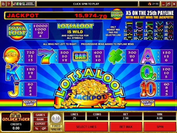 Если вы не желаете проводить свое свободное время без игровых автоматов, то обратите внимание на новый продукт компании «Microgaming» - видео-слот «Lots A Loot». Игра на таких автоматах не будет опасной для финансов игроков, потому что не предусматривает никаких расходов. Аппарат «Множество Трофеев» предоставит возможность отправиться на состязание с очень азартными геймерами, после чего возможно удастся выиграть поднос с золотом. Необходимо обратить внимание на материал, из которого изготовлен поднос, так как он тоже драгоценен и станет притягательным для аудитории игроков. Предлагаемый автомат относится к классическому варианту, но с более расширенным функционалом и интерфейсом. Общее описание Lots A Loot привожу ниже.