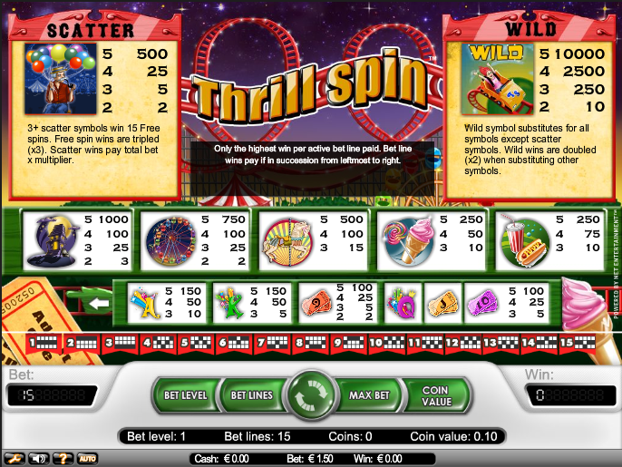 Если вы желаете играть без оплат и регистрации, то сможете оценить автоматы «Thrill Spin». Данная игра сможет вызвать большой выброс адреналина у игрока. Именно захватывающая линия сюжета и приятная музыка смогут увлечь в игровой процесс на необычном симуляторе. Так, представиться возможность покататься на американских горках и прочих известных аттракционах, которые смогут помочь окунуться в экстремальный мир.
