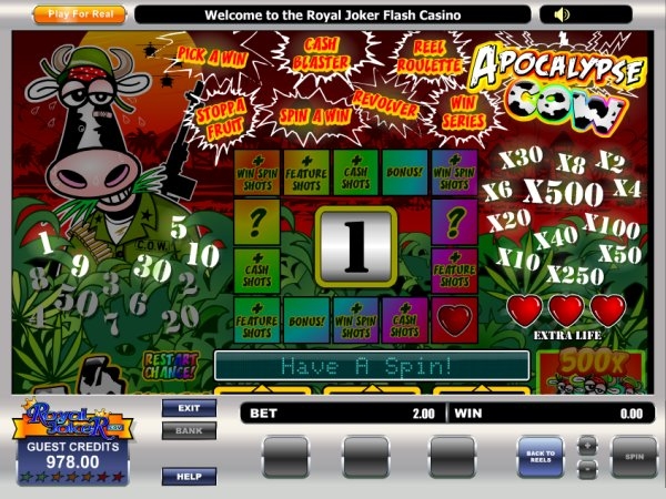 Игра под весьма экстравагантным названием «Корова апокалипсиса» хоть и очень проста, но выполнена со вкусом. На плечи игрока ложится только одна задача – определить размер ставки, все остальное сделает программа. Сумма ставки, кстати, на одно вращение может варьироваться от десяти центов до десяти условных единиц. Как мы уже говорили, игра очень проста, а все потому, что это классический фруктовый с одной линией выплат.