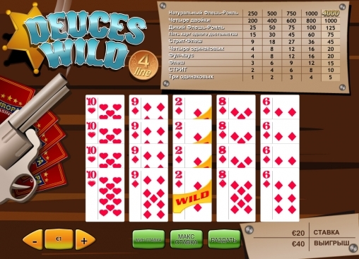 Правила игры на слоте «Дикие двойки online» практически ничем не отличаются от правил классического ее варианта. Ведется она на одну руку стандартной карточной колодой без джокеров. На одну раздачу можно ставить от 1 до 5 монет. Их номинал при этом может варьироваться от 5 центов до 5$. То есть максимальная ставка равна 25 долларам, а минимальная – 5 центам.