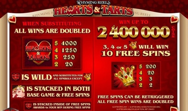 Если вы все же решитесь запустить барабаны игрового автомата «Rhyming Reels Hearts and Tarts», не сомневайтесь в том, что получите массу позитива и удовольствия, благодаря обилию оплачиваемых комбинаций, приятному музыкальному оформлению (оно в этой игре очень легкое и ненавязчивое), качественной графике. На барабанах появляются тематические изображения и карточные символы. Роль вайлда, с присущей ему функцией замены других символов, выполняет алое сердце. Изображение короны считается скаттером, приносящим бесплатные вращения. Происходит это, кстати, довольно часто. Так что не стоит откладывать свой визит к щедрой Королеве!