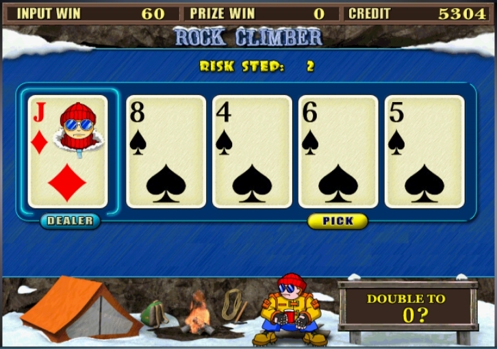 Любой игрок, который любит рисковать, может воспользоватся услугой игры на удвоение и, тем самым, попробовать увеличить свой выгрыш в два раза. Суть игры проста и понятна любому: на игровом экране будут показаны пять карт и игроку необходимо открыть карту, которая по номиналу будет выше, чем карта дилера. Если игроку это удастя – текущий выгрыш будет увеличен в два раза, в случае неудачи – полученный ранее выигрыш обнуляется, а если будет ничья – раздача карт повторится.