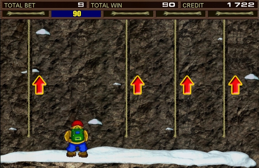Это еще одна возможность получить неплохой денежный приз, играя на слоте Скалолаз. Чтобы начать бонусную игру, вам потребуется помощь удачи. Поскольку игра запустится только после выпадения трех альпинистских веревок. Узнать о начале бонусного раунда вам также поможет специальная мелодия и появление на экране пяти веревок. Теперь ваше основное задание - добрать до самой вершины горы и ни разу не сорваться. Чтобы не упасть, вам предстоит выбрать нужную веревку. Правда, не все так просто. Под одной из карт с изображением веревки может оказаться пещера с необычным страшным зверем. Это будет означать, что вы сорвались и бонусная игра закончится.