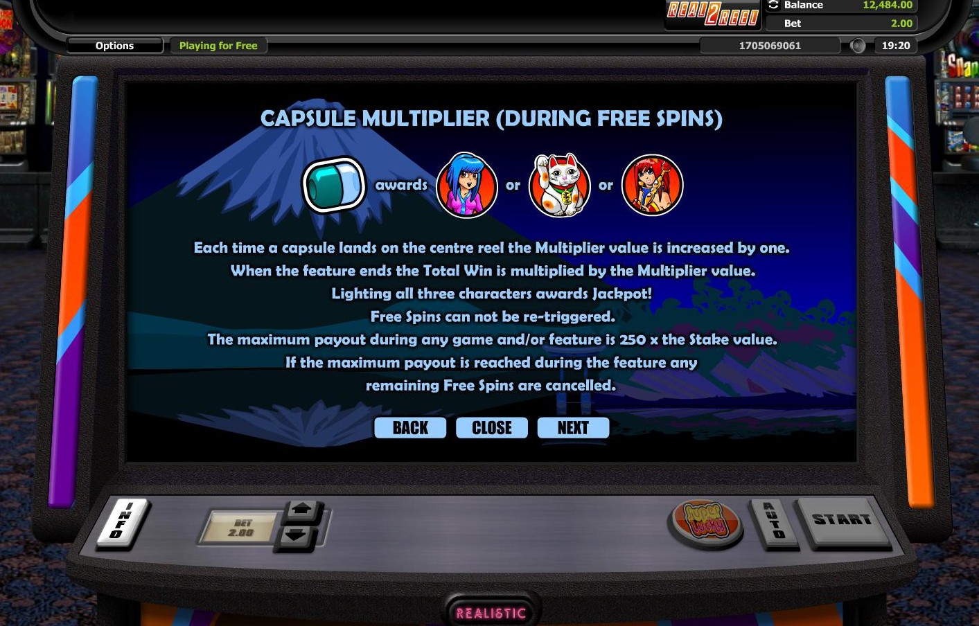 Бонусный раунд начнется, если у вас выпадет три одинаковых символа с капсулами. Если же капсула выпадет во время бонусного раунда бесплатных вращений, вспыхнет подсветка одного из персонажей и мультипликатор увеличится. Если же вам повезет и все три капсулы появятся на интерфейсе, то вы получите джекпот. В этот момент будут зажжены все три символа персонажей. По окончанию бонусной игры, общий выигрыш увеличится на размер выигрыша, умноженный на коэффициент мультипликатора. Бесплатные спины не запускаются заново, как это бывает в других играх. Максимальная выплата в игре 250 ставок. Если ваш выигрыш уже составил ставку 250х, тогда оставшиеся бесплатные спины просто сгорают.