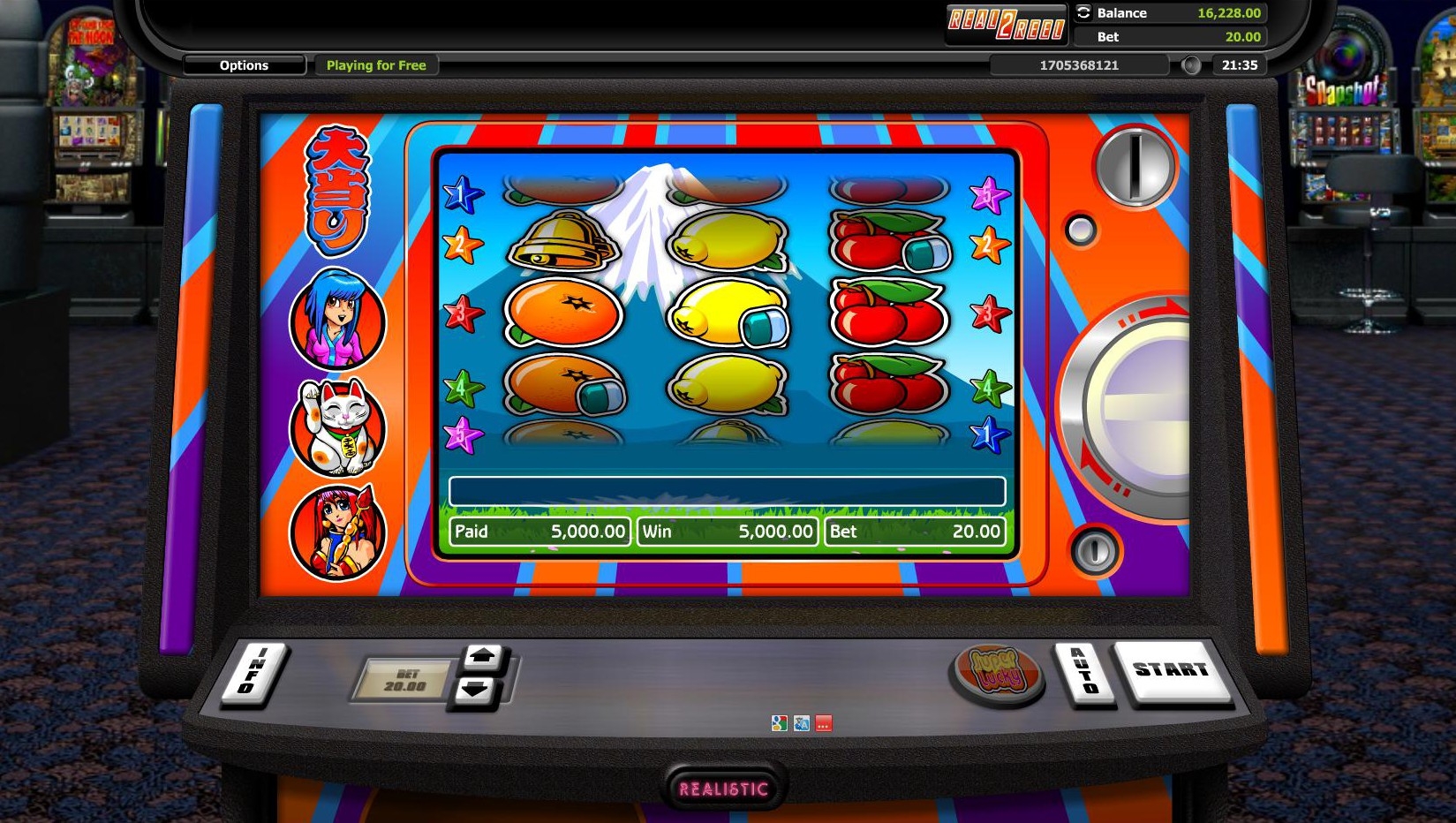 Super Graphics Super Lucky изображен в виде слота в зале казино. На экране вы сможете увидеть другие игровые автоматы по соседству с вашим слотом. Если пожелаете, вы можете включить другой режим отображения – интерфейс крупным планом. Для этого нужно нажать кнопку Real 2 Reel.
