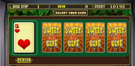 Сразу станет доступной после выпадение любой выигрышной комбинации, у вас будет два варианта выхода: забрать свой выигрыш или сыграть в раунд на удвоение. В ходе игры на риск перед игроком будут показаны карты, игроку необходимо будет угадать цвет скрытой от него карты. Очевидно, если игроку повезет – удвоение ставки у него в кармане, а если нет – выигрыш сгорит. После удачного, для игрока, завершения игры на риск можно повторить всю процедуру снова.