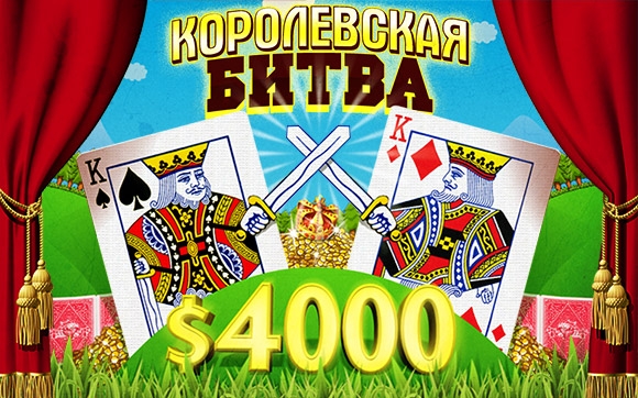 С 10 по 21 марта 2014 года Вас ждет "Королевская битва" и королевские премии! Убедите соперников, что именно Вы - король азарта и получите главную награду в размере 750$. Лидером королевской битвы станет тот, чья общая сумма ставок на турнирных слотах окажется самой большой. Всем призерам будут начислены достойные суммы в долларах. Будьте активны, делайте взносы побольше, и забирайте свои законные $750!