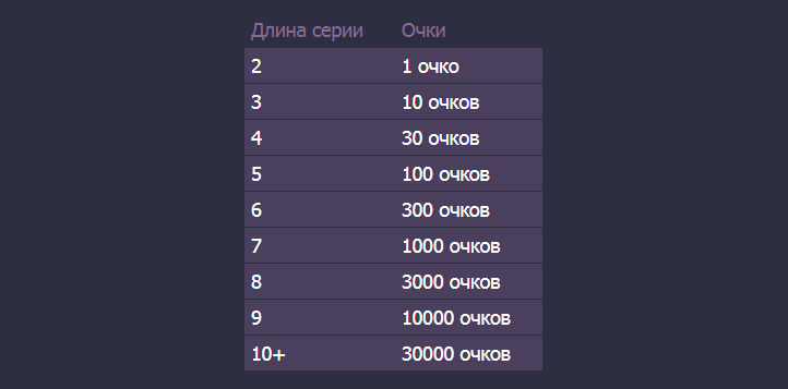 - Турнирные очки набираются путем суммирования выигрышных серий. Серией называется последовательность 2 и более выигрышных раундов, где сумма выигрыша в игровом раунде превышает общую сумму ставки игрока. Например, игрок играет по 9 линиям с монетой 1 рубль, общая ставка игрового раунда составляет 9 рублей. В случае, если игрок получает подряд от 2 выигрышных серий с выигрышем от 9,1 рублей и выше в каждом игровом раунде в турнирную таблицу записывается 1 балл и выше, согласно таблице ниже.