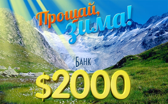 С 24 по 28 февраля 2014 года участвуйте в супер турнире "Прощай зима"! Запускайте барабаны щедрых слотов, делайте крупные ставки и докажите, что именно Вы достойны победы. На кону солидная сумма – 2000$. Чтобы выиграть главный приз – 400$, достаточно сделать максимальную сумму ставок. Не упустите возможность хорошенько отпраздновать завершение зимы! Веселитесь, наслаждайтесь слотами и заработайте 400$!