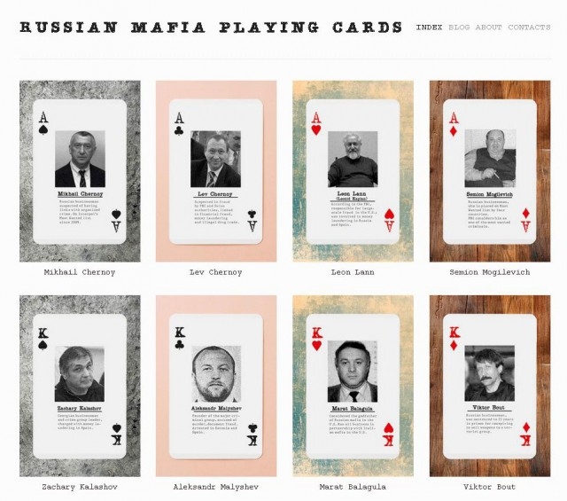 На этой колоде карт изображены люди, которые имеют отношение к криминальному миру, по крайней мере, по мнению авторов проекта. Например, на одной из карты вы увидите Виктора Бута, незаконно торговавшего оружием, Семена Могилевича, который, как утверждают в ФБР, является самым авторитетным в мире русским мафиози, Тевтика Арифа, Марата Балагула и других выходцев из бывшего СССР, которые тем или иным образом имеют связи с миром преступности. Интересно то, что в данной колоде нет «шестерок».