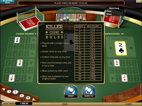 Одной из новинок карточных игр в онлайн казино является “Killer Ckubs”. Правила этой игры достаточно просты. Используется колода из 52 листов, из которой по очереди достаются карты. Когда выпадает масть трефа, игрок проигрывает. При выпадении другой масти, наоборот, выигрывает.