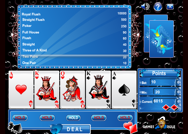 Правила понятны каждому игроку. Вначале нужно сделать ставку, и это можно сделать несколькими способами: при помощи кнопки Bet One, при помощи кнопки Bet Max. Используя кнопку Bet One, вы прибавляете к вашей ставке еще одну фишку, а используя Bet Max, вы ставите максимально возможную ставку в видеопокере. Если вы передумали, и желаете вернуться к маленькой ставке, достаточно будет лишь нажать на кнопку Bet One снова.