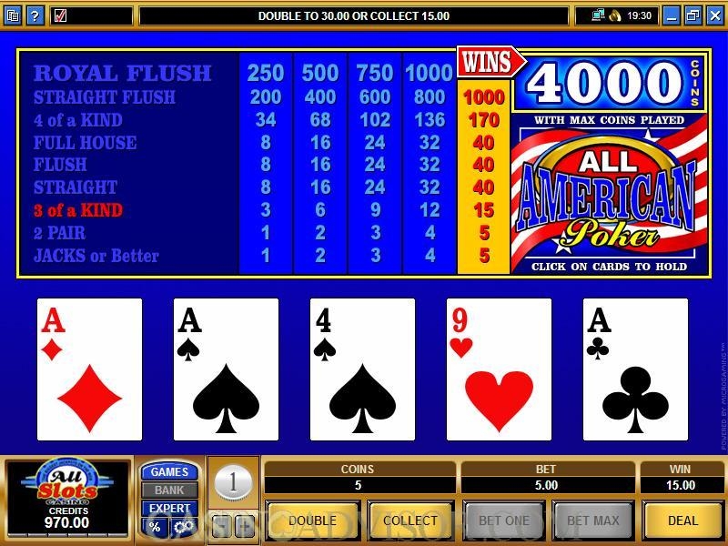 Этот эмулятор покера должен бы понравиться каждому азартному человеку, который мечтает побывать в Америке. Вместе со слотом «All American» вы незамедлительно отправитесь в далекое и очень увлекательное путешествие за океан, причем не просто так, а для участия в престижном покерном турнире. Вашими соперниками в нем будут только профессиональные игроки, поэтому стоит хорошенько подготовиться и отточить свое мастерство. Судя по названию, в этом турнире всегда побеждали только американские игроки, но сложившуюся ситуацию изменить можете именно вы. Докажите зазнавшимся американцам, что у нас в покер играют не хуже, а даже лучше. Слот «Все американцы» обязательно и сам окажет игроку поддержку, если тот, конечно, будет уверен в своих силах. Эта игра стоит свеч, ведь за победу в турнире его организаторы обещают серьезные призовые.
