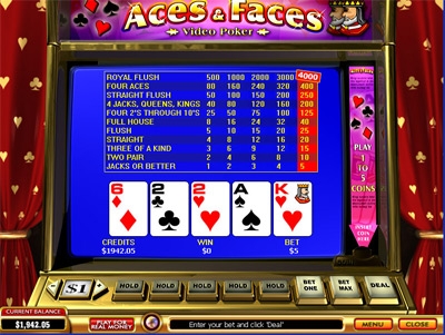 Как и во всех других автоматах такого рода, в «Aces and Faces» таблица с выигрышными комбинациями расположена вверху экрана. Карты пользователя размещены по центру. Под ними две кнопки. Первая называется «BET» и отображает она текущую ставку. Вторая «WIN» показывает, сколько удалось выиграть в предыдущем раунде. Еще ниже расположены пять кнопок «HOLD». Ими фиксируются те карты, которые выберет игрок. Рядом есть еще несколько кнопок управления.
