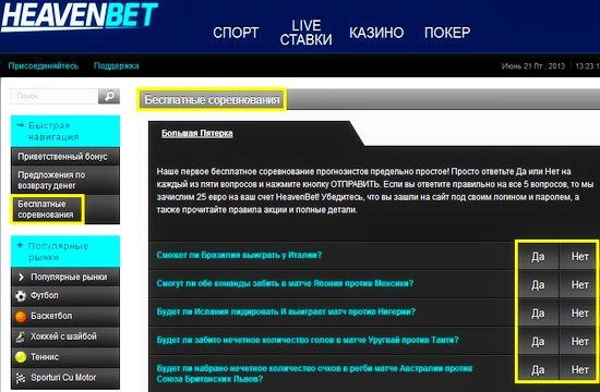Если сравнивать с другими популярными букмекерскими конторами, то коэффициенты в HeavenBet хоть и не высоки, но никогда не падают ниже средних.