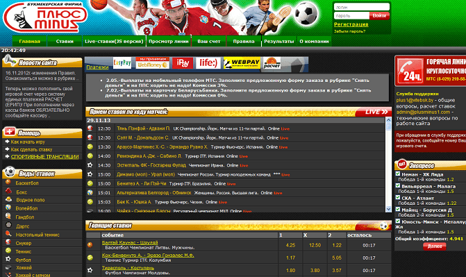 Традиционно стоит рассмотреть положительные и отрицательные стороны данного заведения. Если начинать с линии, то она довольно хороша. Просторная роспись, огромный выбор матчей. Наша линия схожа на девяноста процентов с букмекерской конторой «Бетсити». Большое количество любителей азартных игр имели печальный опыт с «Бетсити», но не один человек не скажет вам, что у них плохая линия. Из этого можно сделать заключения, что у «Плюс Минус» - огромный выбор матчей. Коэффициент держится не ниже уровня: 1,9 на 1,10, что является для фирмы таких размеров довольно хорошим показателем. Прекрасный лайв - множество разных матчей, позволяет поставить ставки практически на все значимые игры дня. Для населения Беларуси положительной стороной стало разнообразие способов оплаты и снятия денег со своих счетов. Их пополнение можно произвести с помощью наличных в пунктах приема, банковской картой, СМС-кой,Webmoney или EasyPay. Для снятия денежных средств с игрового счета также существуют разные способы, один из которых пополнение денежных средств на своем мобильном. Подытожим написанное выше: к положительной стороне можно отнести: прекрасную линию, нормальный коэффициент, лайв, разнообразие способов пополнение и снятие денег с игровых счетов(что особенно актуально жителям Беларуси).