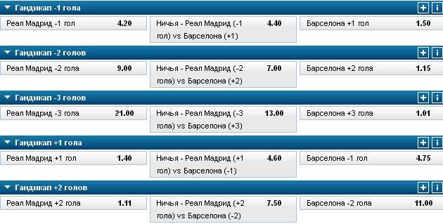 Как и в предыдущей статье, снова рассмотрим в качестве примера ставки на предстоящий матч Реала с Барселоной. Ставка с форой на Барселону (гандикап +1) будет выиграна, если матч закончится ничьей или гости одержат победу. Возможный счет при таком раскладе может быть 0-0, 0-1, 1-1, и далее. Если Реал Мадрид выиграет с разрывом в 1 гол, тогда ставка вернется игроку. Допустим, матч закончится со счетом 1-0, 2-1, и далее. Аналогично рассчитываются ставки при форе +2.