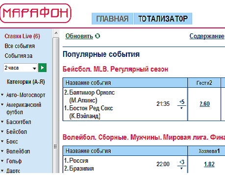 Также контора может похвастаться весьма низкой маржей на исходы. Коэффициент на равный по вероятности исход, как правило, равен 1.95 к 1.95. Основным отличием "Марафона" от других подобных компаний является то, что данная БК не имеет постоянной маржи. Коэффициенты могут изменяться от 1.86 к 1.86 до 1.97 к 1.97 (все зависит от популярности турнира и вида спорта).