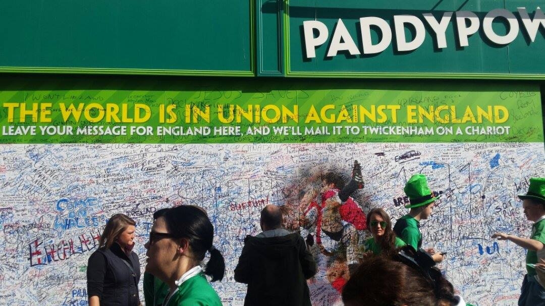 Еще недавно букмекерская контора Paddy Power объединяла лишь влюбленных в специальных кабинках в Дублине. Сегодня же компания предлагает болельщикам регби объединиться против команды Англии во время чемпионата по регби. Новая рекламная акция Paddy Power снова провоцирует.