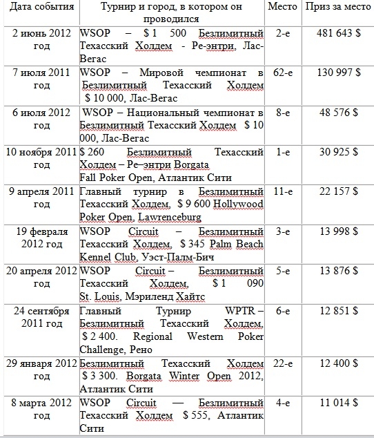 Сейчас я предлагаю вам просмотреть таблицу с самыми лучшими результатами Аманды за ее покерную карьеру. Все события в таблице расположены в порядке уменьшения суммы выигрыша.