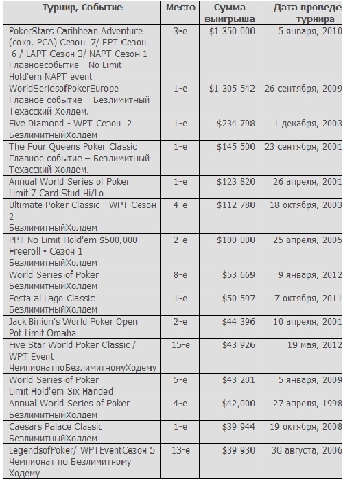 Отличный игрок и самое главное при этом отличный семьянин. Достаточно плодотворно пограли в покер на разных покерных турнирах и сумел заработать на этом немалые деньги. Побольше бы таких людей, которые умудряются преуспевать во всем, а не только зацикливатся на деньгах.