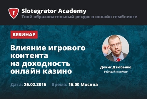 Тема первого вебинара: «Влияние игрового контента на доходность онлайн-казино». Проводить онлайн семинар будет ведущий менеджер по продажам компании Slotegrator LTD Денис Дзюбенко.