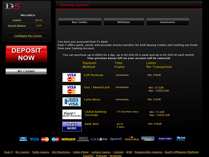 Казино «Дуэль 5» имеет многоязычную поддержку, другими словами казино переведено на несколько языков, примечательно, что в списке присутствует и русский язык. Доступ к казино ограничен лишь для жителей США.