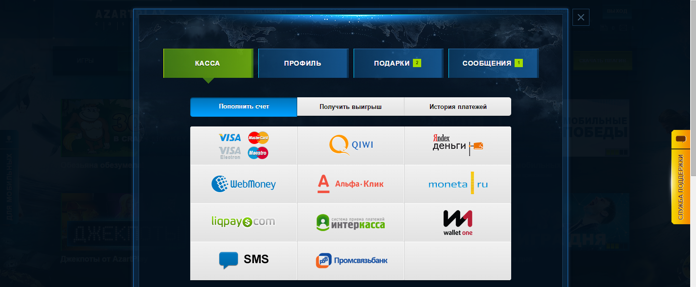 Минимальный депозит в этом онлайн казино равен тремстам рублям, а выводить можно суммы, начиная со ста рублей. Выплаты осуществляются в основном моментально, хотя в некоторых исключительных случаях приходится подождать, но не более двадцати четырех часов. Играть на настоящие деньги в «Азартплей» вовсе не обязательно, ведь можно это делать и в бесплатном демонстрационном режиме. Программу казино не нужно скачивать на свой компьютер и устанавливать какое-то дополнительно обеспечение. Все игры доступны прямо в браузере.