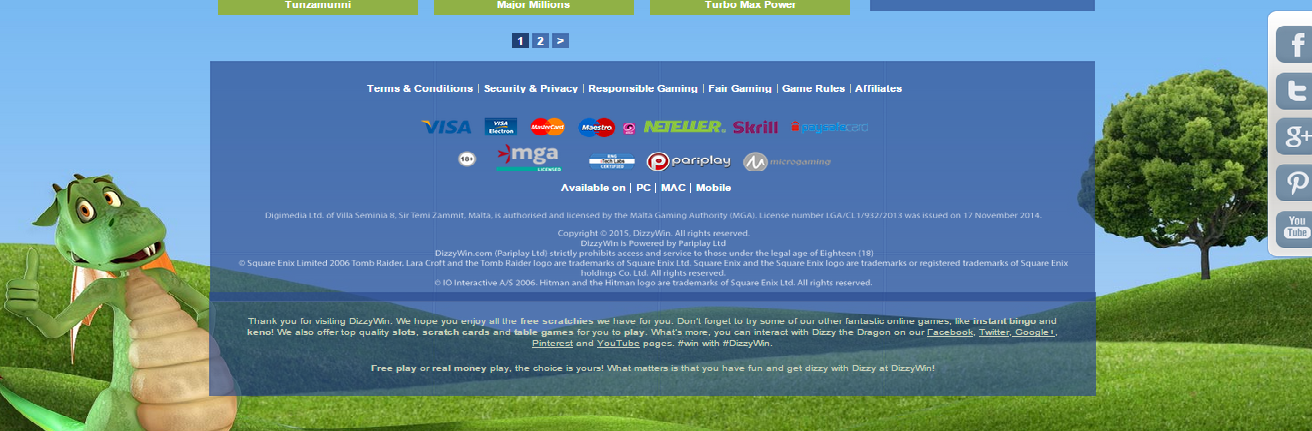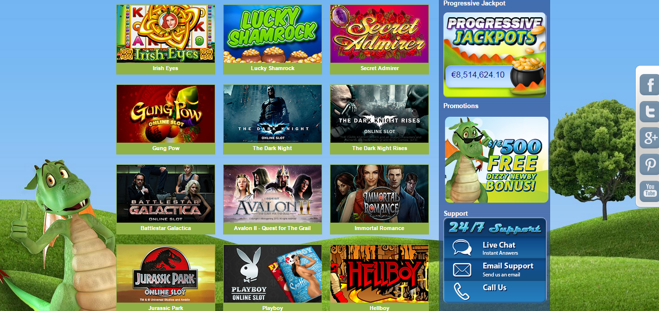 На беззаботность настраивает дизайн казино – легкий и веселый. Преобладают салатовый, светло-зеленый и желтый цвета. Радуют глаз яркие баннеры и разноцветный текст. А изюминка оформления – это зеленый дракоша, который зазывает клиентов в игорное заведение. Могу точно сказать, что все это делает DizzyWin Casino очень запоминающимся заведением, но лично у меня сложилось несколько легкое, несерьезное отношение к нему.