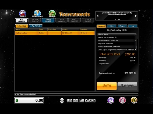 В интернет казино «Big Dollar» для постоянных клиентов заведения действует программа лояльности. За ставки, сделанные реальными деньгами, игрокам начисляют комп-пойнты. Один такой комп-пойнт, зависимо от игры и от уровня игрока, можно обменять на десять, двадцать, двадцать пять, пятьдесят, сто или двести долларов.