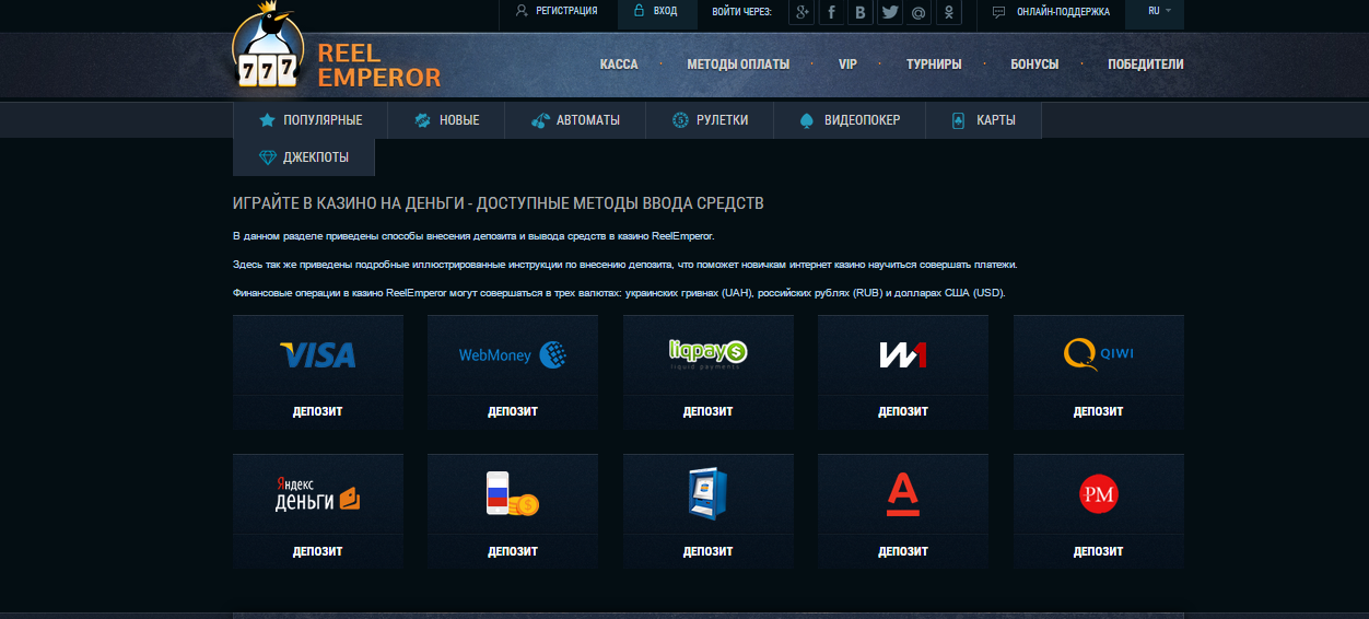 В казино Рил Эмперор принимаются доллары США, рубли и гривны. Подробнее о лимитах вывода денег читайте на сайте казино.