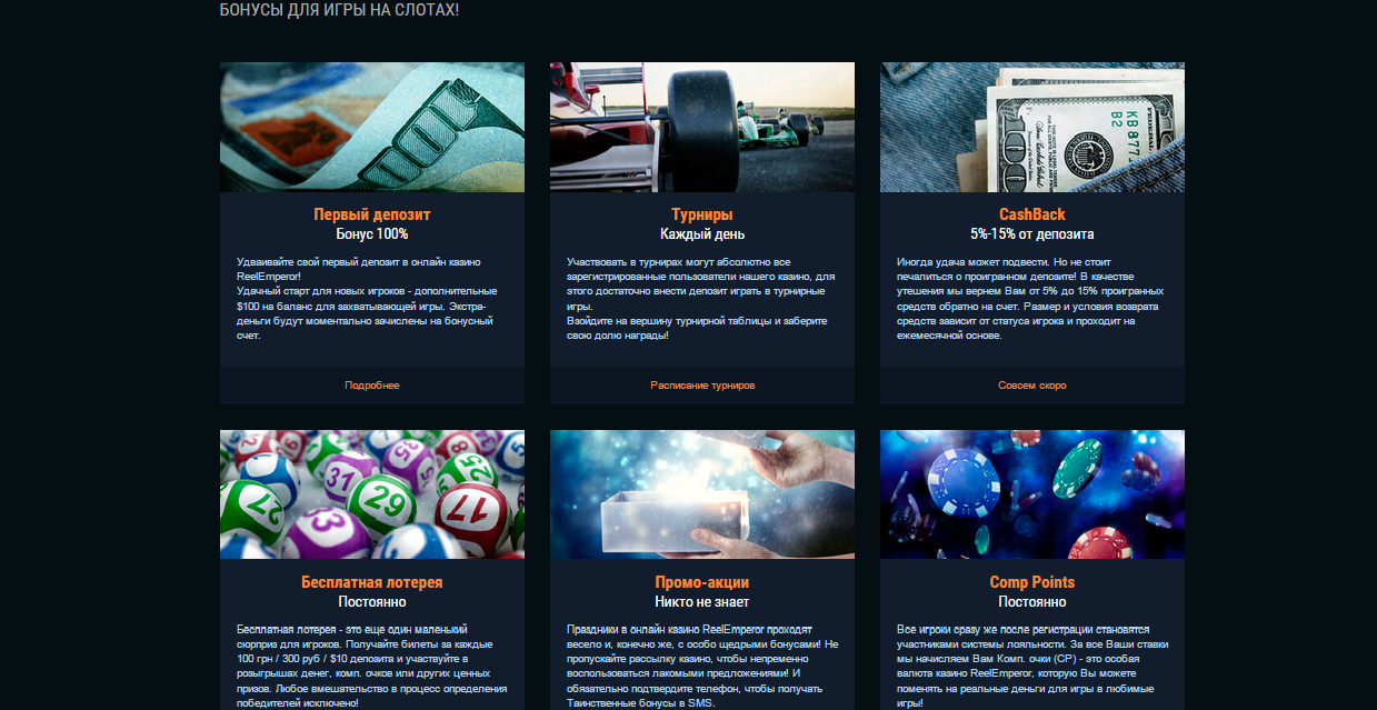 И еще один плюс – в Reel Emperor Casino каждую неделю проходят турниры по разным азартным играм. Об условиях участия игроки могут узнать на сайте казино в разделе «Турниры».