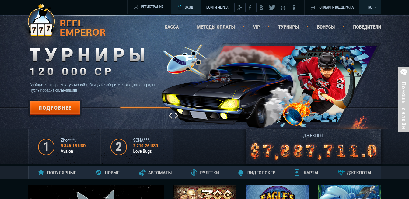 Сайт казино удачно структурирован, интерфейс удобный. Казино вещает на русском языке. Оператор казино – компания Нет Интертеймент, софт от Микрогейминг. Игры открываются прямо в браузере, скачивать и устанавливать казино не нужно. А чтобы стать клиентом, достаточно пройти регистрацию с помощью электронной почты или своей страницы в социальной сети. Казино имеет два условия к своим клиентам: это возраст от восемнадцати лет и законность онлайн азартных игр в стране, гражданином которой является игрок. Reel Emperor Casino есть во всех популярных социальных сетях, так что информацию о казино можно почерпнуть в Твиттере, Фейсбуке, ВКоннтакте.