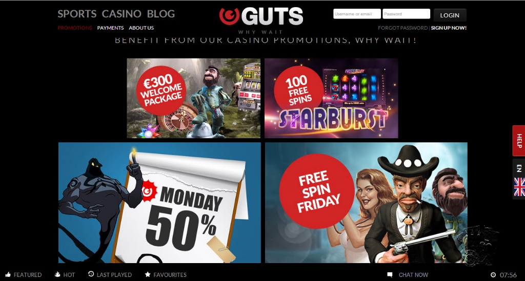 Недавно один мой старый товарищ рассказал мне про увлекательное казино Гатс. Что ж, его рассказ меня очень заинтересовал и я решил тоже посетить сайт Guts Casino.