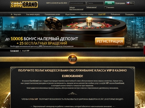 С первого предложения хочу отвесить комплимент дизайнеру данного игорного заведения. Цветовая гамма, пордбор картинок и лаконичные надписи придают Еврогранду особенной эллегантности. Хочется остаться именно в этом казино, потому что на его страницах чувствуешь себя настоящим игроком. Если вы консерватор и не любите лишней суеты – выбрайте Еврогранд.
