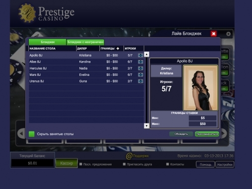 Казино Престиж выдержанное и элегантное, оно понравится консервативным игрокам. Скромный синий фон, ненавязчивые баннеры, завораживающие улыбки лайв-дилеров – это все неоспоримый плюс в оформлении. Возможно, притязательным посетителям фон казино покажется скучноватым, но открыв раздел с играми, они забудут о цветовой гамме казино и окунутся в мир азартных приключений.