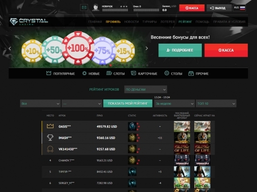 Бонусная политика направлена на привлечение новичков и удержание постоянных клиентов. Получив стартовый бонус от Crystal Casino, вы надолго станете клиентом этого заведения. Информацию о депозитных и бездепозитных бонусах от Crystal Casino можно найти на сайте игорного дома. Я же расскажу вам о программе лояльности, которая заключается в коллекционировании комп-пойнтов, которые игрок получает за ставки и меняет на деньги. А курс обмена разный для всех игроков, он зависит от того, насколько давно и успешно клиент играет в Crystal Casino. Так, новичок поменяет свои комп-пойнт по минимальному курсу, а вип-игрок – по максимальному. В этом смысле Crystal Casino является выгодным заведением для азартных развлечений онлайн, если вы играете регулярно.