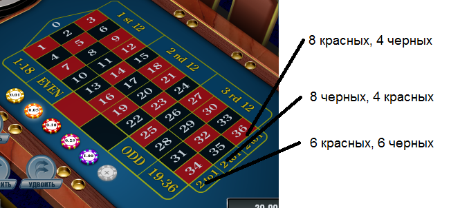 Если разделить игровое поле из 37-ми номеров визуально на три продольные полосы, то получим колонки, приставке на которые выплаты производятся в размере 2 к 1.