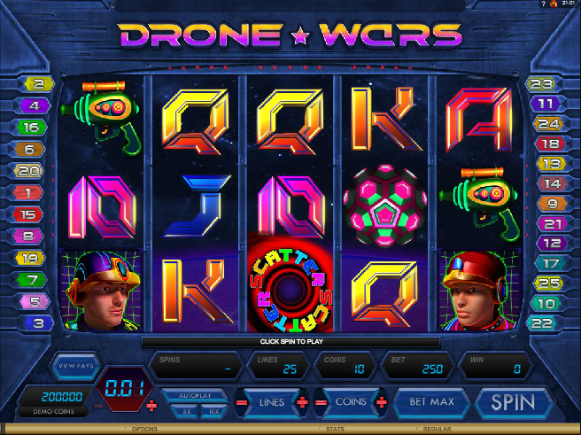 #2 Drone Wars (Война Дронов)Отвлечемся ненадолго от Второй Мировой войны. Военную тему продолжает фантастический слот Drone Wars. Война Дронов это пятибарабанный непрогрессивный слот, с 25-ю линиям выплат от Microgaming. В нём есть дикий символ, рассыпной символ и символ бесплатных вращений, а также максимальный джек-пот в размере $4,000.