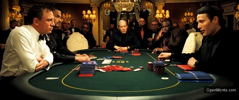 Наш кинолюбительский список все же ориентируется не на сложную сюжетную линию, а на красивую и эффектную картину, передающую атмосферу казино, на втором месте поставим сцену игры в покер в «Казино Рояль» (Casino Royal). Маловероятная, как и вся сага о Бонде, но безоговорочно красивая сцена, где Дэниел Крейг в роли Джеймса Бонда играет против своего противника на 115 миллионов фунтов стерлингов и бьет фулл-хаус стрит-флешем.
