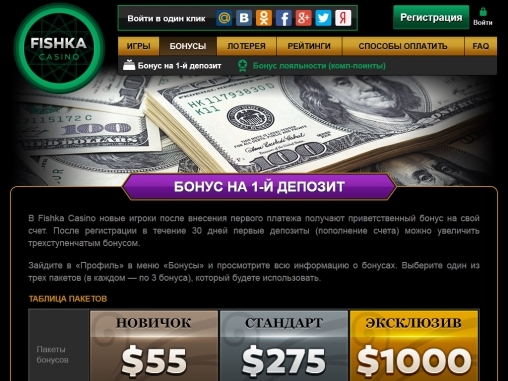 Бонусная программа «Фишки» для новичков состоит из трех пакетов – «Новичок», «Стандарт», «Эксклюзив» (выбрать можно только один, зависимо от суммы пополнения счета). В свою очередь, в каждом из них тоже предлагается по три бонуса. Более детально о правилах начисления бонусов и их отыгрыше можно прочесть в специальном разделе сайта.