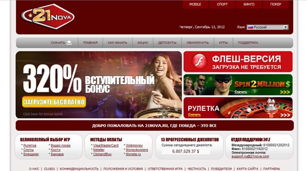 Еще одним великолепным игорным заведением является 21Nova Casino, которое использует софт от фирмы Playtech. Кроме первоклассного программного обеспечения данному казино есть чем еще похвалиться, к примеру, неплохой бонусной программой либо прекрасным дизайном самого сайта казино.